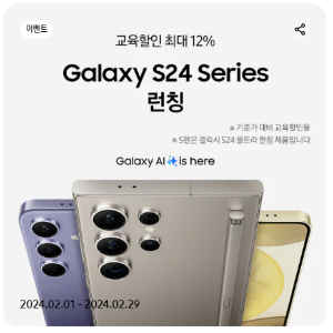 - 갤럭시 S24 : 최대 12% 교육 할인 + 갤럭시 폰 반납 시 최대 15만 원 보상