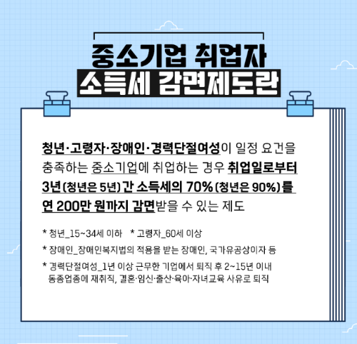 중소기업 취업자나 재직자 중 아래 기준에 해당한다면 이 제도로 소득세를 감면받을 수 있습니다